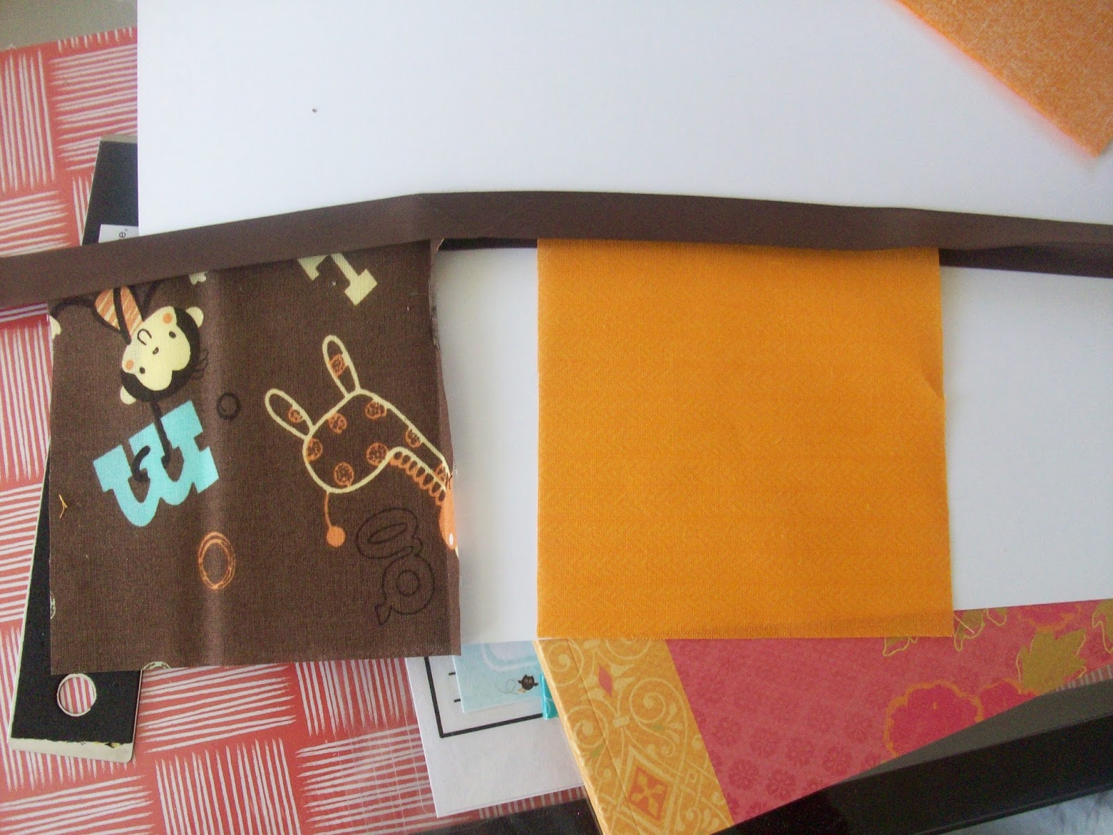 Since my son (who is now 21 months) will also be following along (or at least in the same room), I decided I might as well make one up for him too. I picked out some fabric (no precuts this time). I went with an alphabet animal themed print and an orange print to brighten it up a little. I picked out a matched bias tape, and got ready.