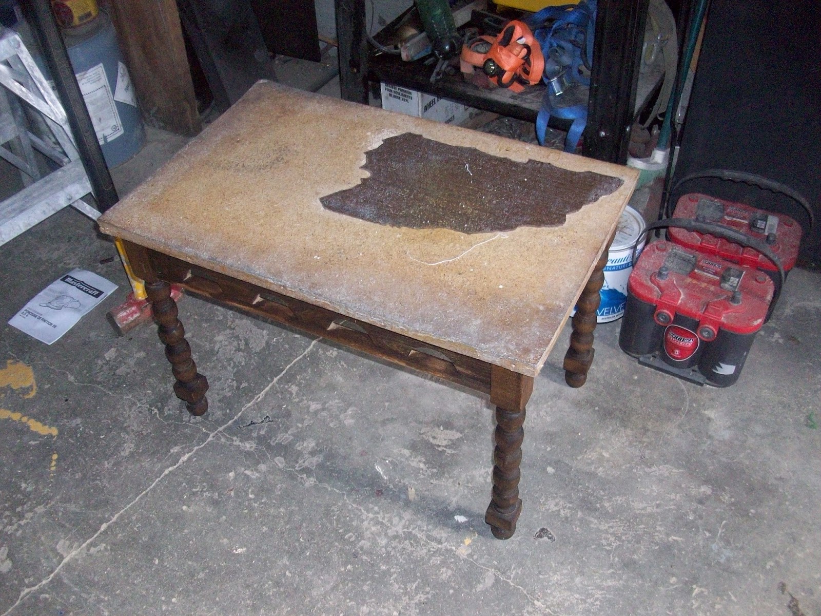 The table was originally covered with vinyl when I picked it up. Above you can see what it looked like when I removed the vinyl.